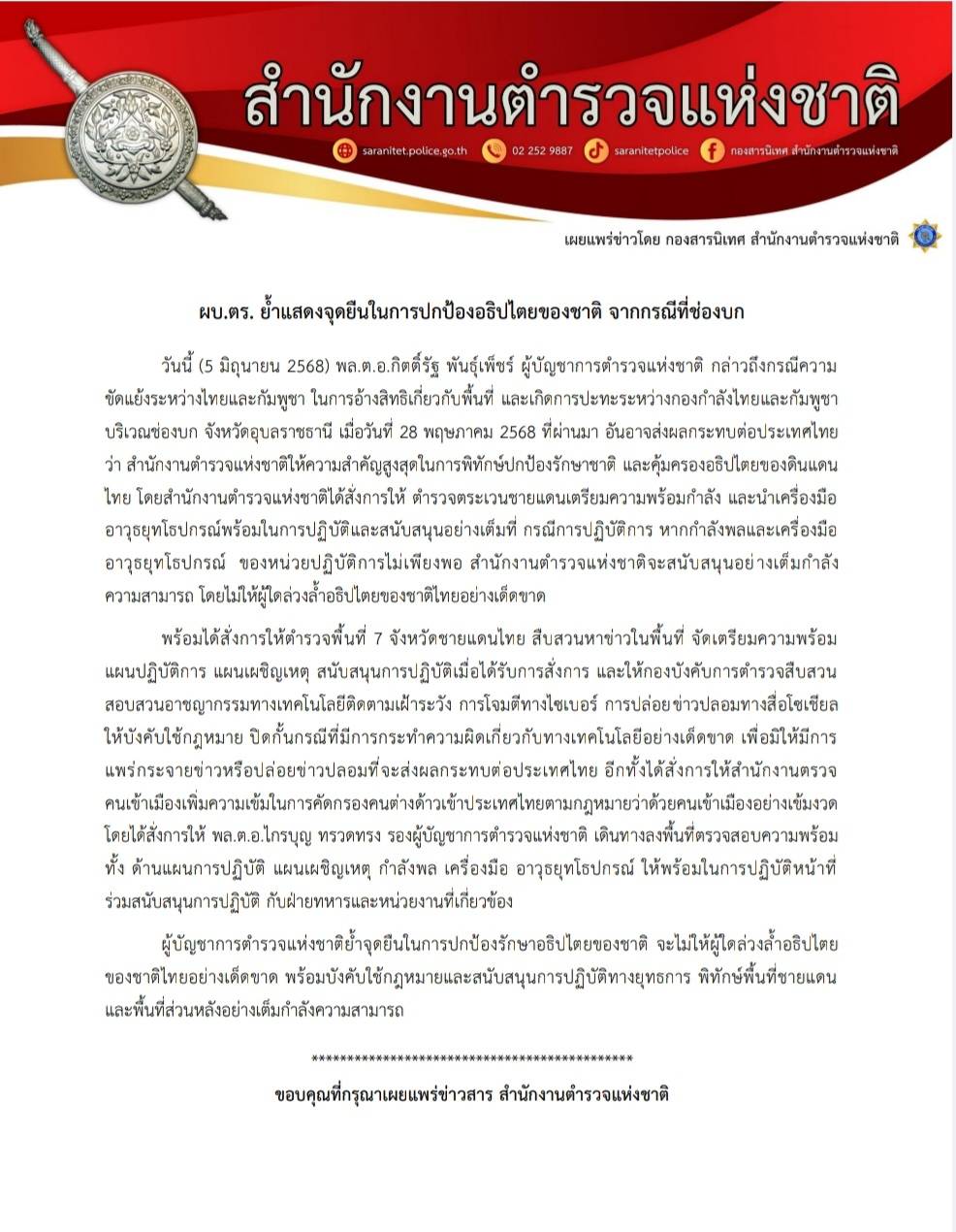 📍 ผบ.ตร. ย้ำแสดงจุดยืนในการปกป้องอธิปไตยของชาติ กรณีความขัดแย้งระหว่างไทยและกัมพูชา ในการอ้างสิทธิเกี่ยวกับพื้นที่ และเกิดการปะทะระหว่างกองกำลังไทยและกัมพูชา บริเวณช่องบก จังหวัดอุบลราชธานี โดยจะไม่ให้ผู้ใดล่วงล้ำอธิปไตยของชาติไทยอย่างเด็ดขาด พร้อมบังคับใช้กฎหมายและสนับสนุนการปฏิบัติทางยุทธการ พิทักษ์พื้นที่ชายแดนและพื้นที่ส่วนหลังอย่างเต็มกำลังความสามารถ